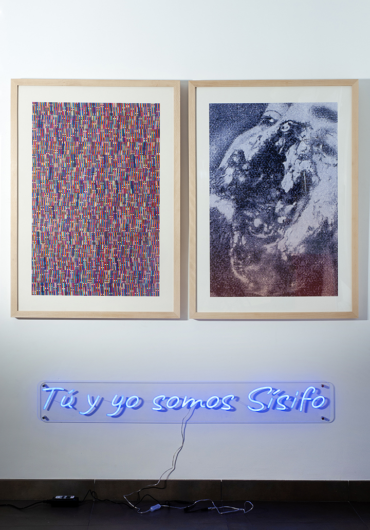 Acuarela y óleo / papel acuarela Arches 600gr, Impresión en papel Museum Etching de Hahnemühle y rótulo luminoso led neón flex con sistema eléctrico. 2024. 163 x 160 cm. Sobre la obra.