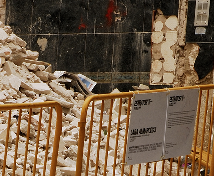 En 2008 tiene lugar en Murcia la muestra artística PAC bajo el título de Estratos. Con tal motivo, la artista Lara Almarcegui realiza una intervención en la calle San Cristobal sita en el centro de la ciudad. Un edificio es demolido, no con motivo del certamen sino por cuestiones económico-urbanísticas (quien sabe si especulativas). Los escombros no son desalojados según instrucciones de la artista que concibe una montaña con todos ellos situada en el centro del solar. La obra genera cierta polémica y debate en cuanto a su nivel de artisticidad y son muchos los que no entienden las intenciones de Lara Almarcegui.