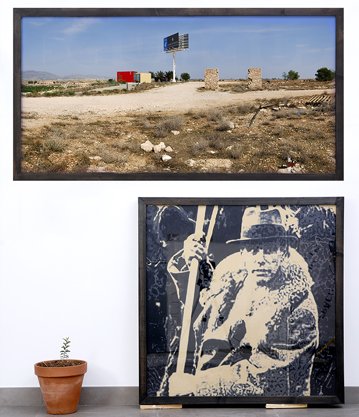 Óleo / contrachapado entelado, imagen fotográfica en papel (injet) / fórex y olivo silvestre trasplantado. 2011. 155 x 180 x 30 cm.