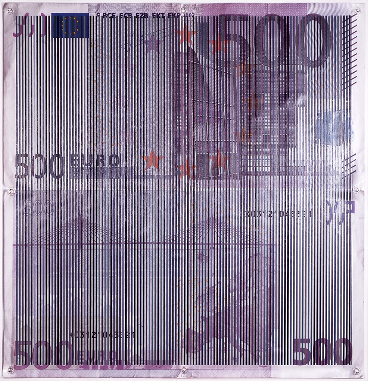 Óleo / imagen fotográfica impresa e lona de PVC, billete de curso legal de 500 euros. 2016. 124 x 128 cm.