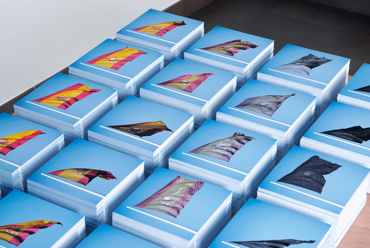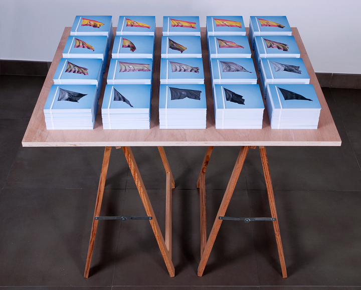 Banderas de 250 x 150 cm dobladas, vitrina de madera y cristal. 2016. 45 x 110 x 120 cm.