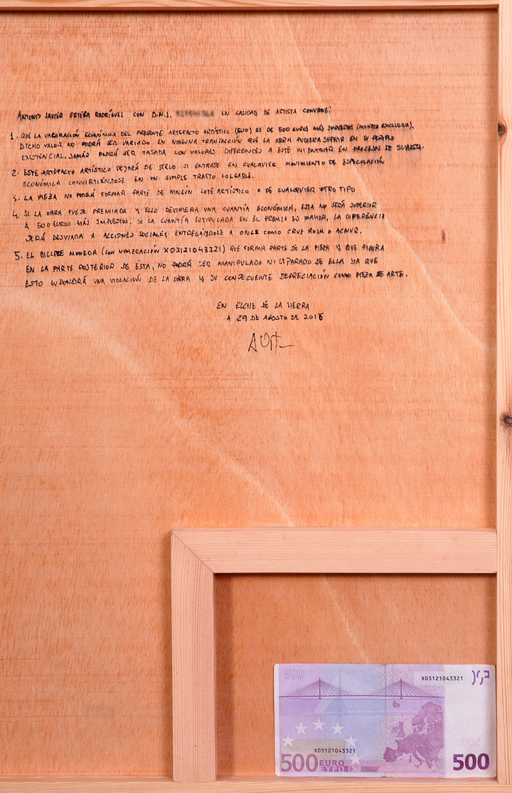 1 Que la valoración económica del presente artefacto artístico (500) es de 500 euros más impuestos (moneda exclusiva). Dicho valor no podrá ser variado en ninguna transacción que la obra pudiera sufrir en su periplo existencial. Jamás podrá ser tasada en valores diferentes a este ni entrar en procesos de subasta.