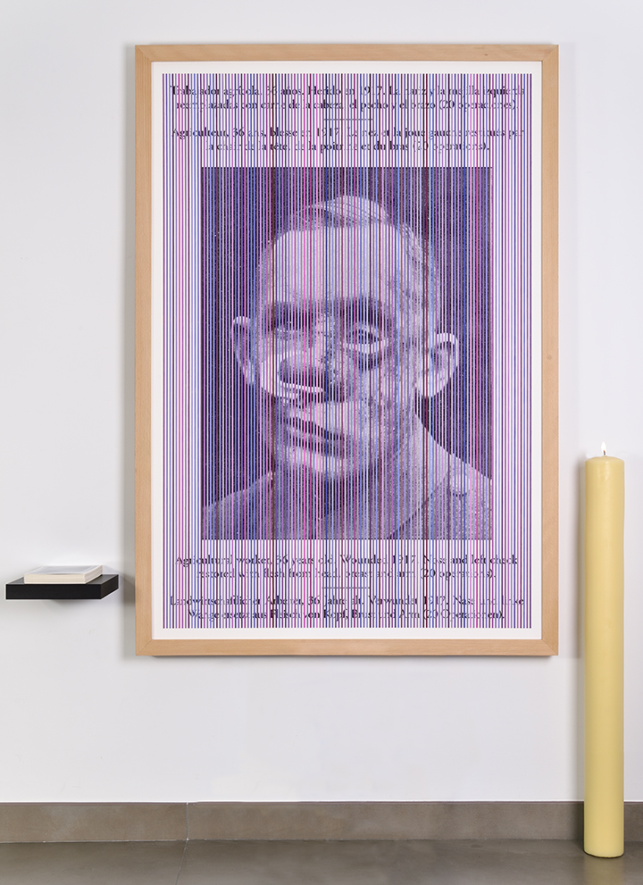Óleo / Imagen fotográfica en papel Museum Etching de Hahnemuhle montado sobre dibond, pegatinas de 22 x 15 cm en polipropileno blanco sobre estante y cirio de cera de 100 cm altura x 10 cm Ø . 2022. Tamaño imagen 102 x 150 cm. Espacio ocupado 150 x 200 x 23 cm.