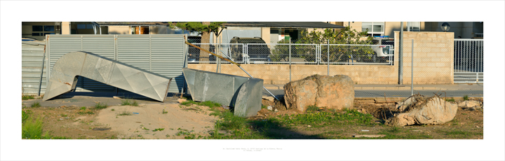 Trabajo de clase abandonado por alumno D.F. 2018 (mixta /contrachapado), imagen fotográfica en papel Museum Etching de Hahnemühle adherida a dibond y pintura spray / plancha de policarbonato. 2022. Díptico 120 x 120 cm.