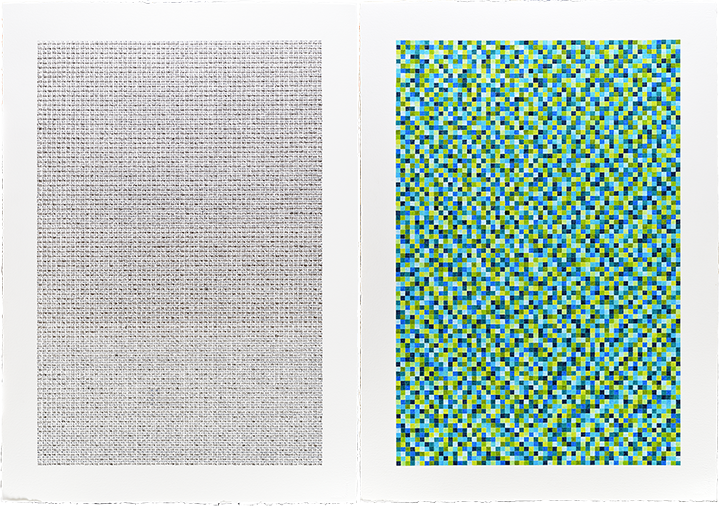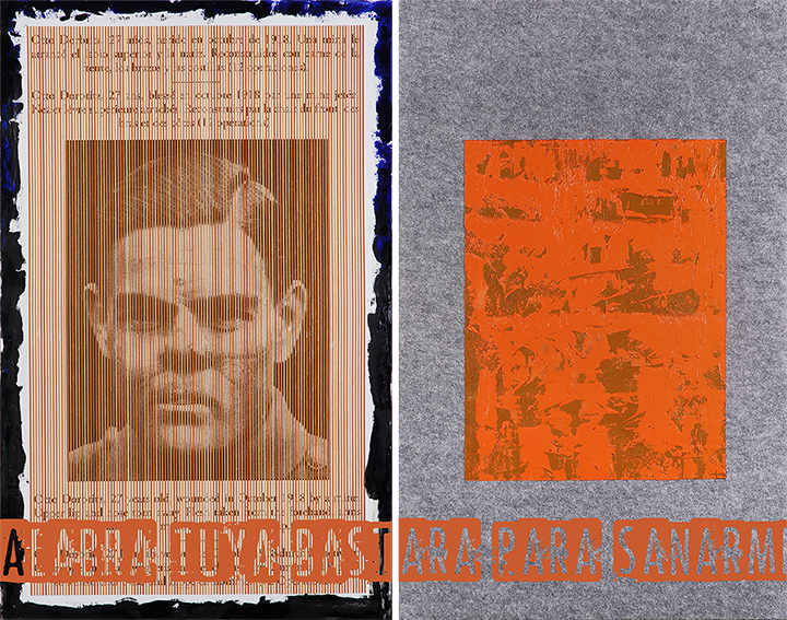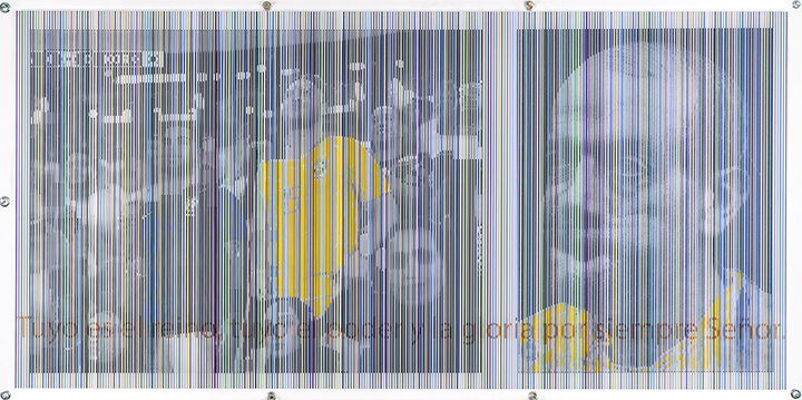 Óleo / fieltro adherido a contrachapado e imagen impresa en tela adherida a contrachapado, impresión en metacrilato. 2023. Díptico 128,5 x 161 cm. Texto.
