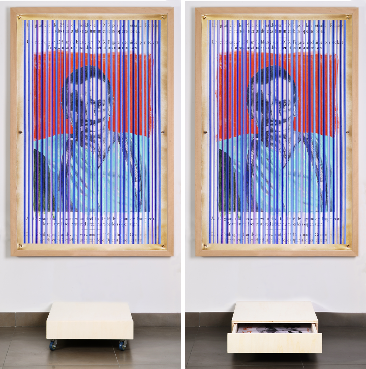 Acrílico y óleo / imagen impresa en lona de PVC adherida a contrachapado con bastidor. Caja de madera con ruedas y carteles en papel. 2023. Enlace descarga cartel para su libre utilización.