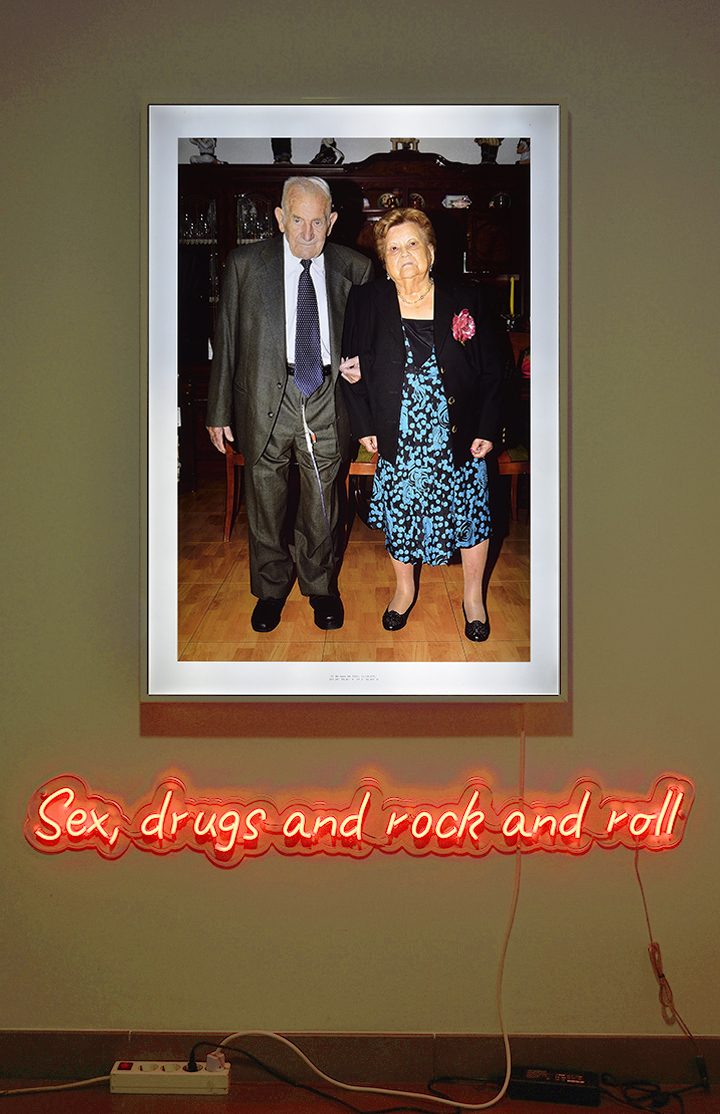 Imagen fotográfica sobre duratrans montada en caja de luz, rótulo luminoso led neón flex y sistema eléctrico. 2023. Tamaño composición 150 x 130 cm.